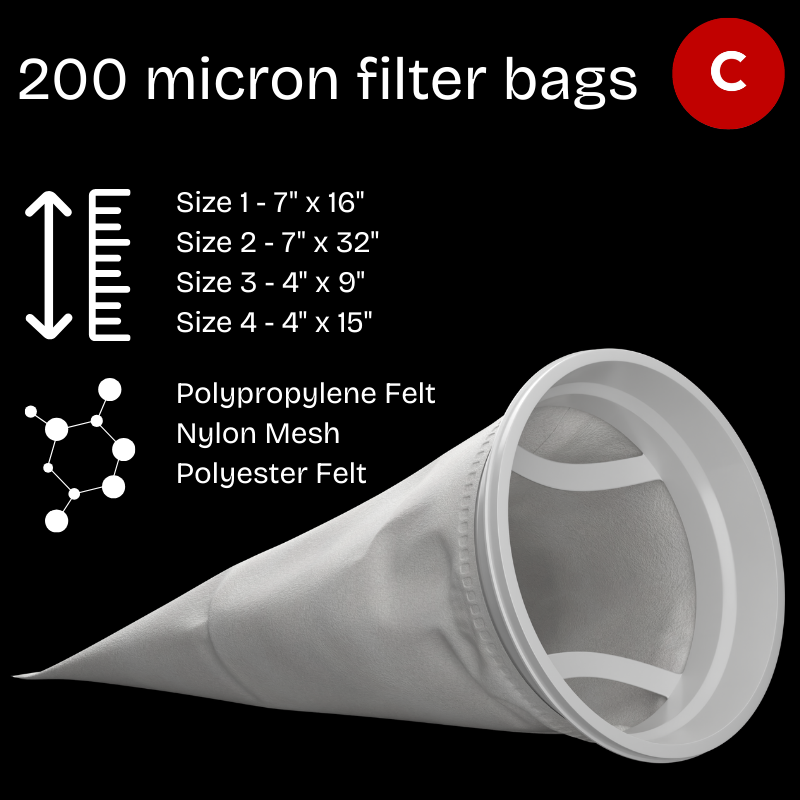 CLARIBag's 200 micron filter bags provide general particulate removal in water, chemicals, paints, coatings, oils, food & beverages. These filter socks are available in polypropylene felt, polyester felt, or nylon mesh. Available in both felt media for depth-loading and mesh media for surface retention. This is the coarsest micron rating available in felt type media.